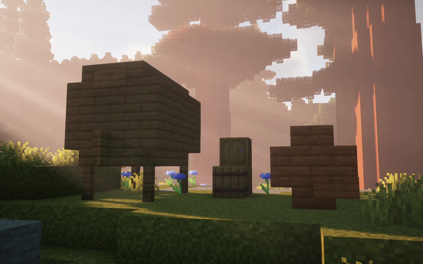 - Маленькая бочка: Строится из 8 ступенек (все из одного типа дерева), формирующих цилиндр. На одной из торцевых сторон, в правом нижнем углу, повесьте табличку. На второй строке таблички напишите: Бочка